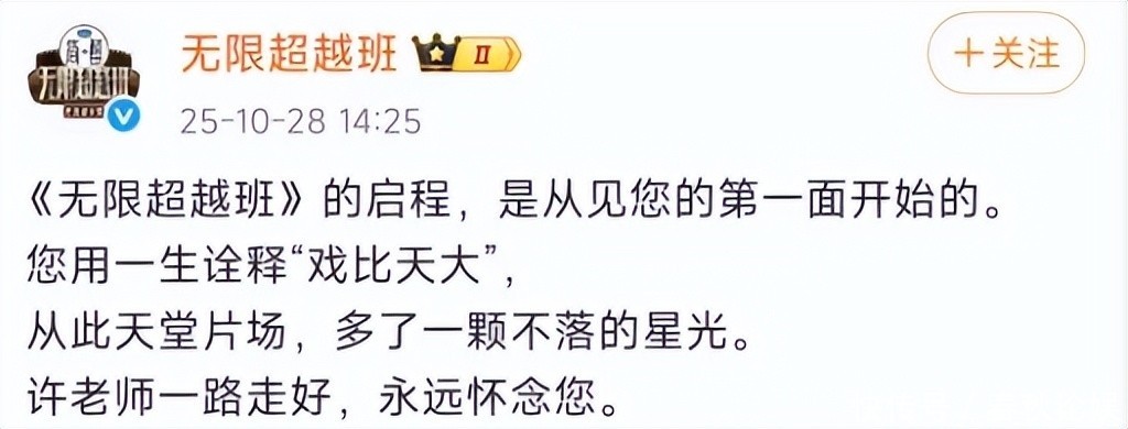 甄子丹、袁咏仪、舒淇、温兆伦等众多明星纷纷发声缅怀,节目《无限超越班》官方账号亦发表致敬长文:从此天上片场,多了一位闪耀的灵魂,许老师,愿您在光影彼岸继续欢笑。